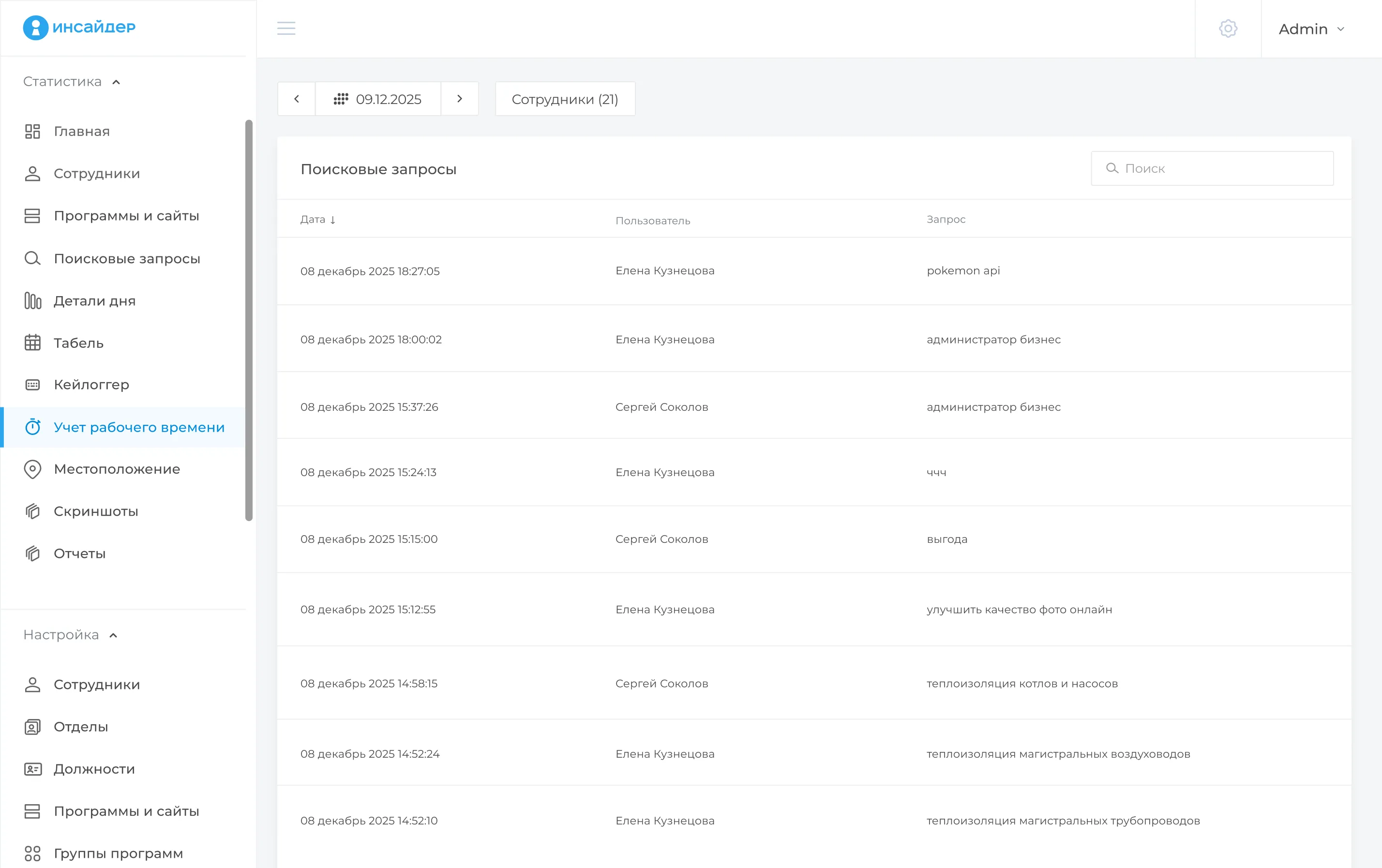 ИНСАЙДЕР позволяет отслеживать запросы, которые сотрудники вводят в поисковых системах Яндекс и Google.
