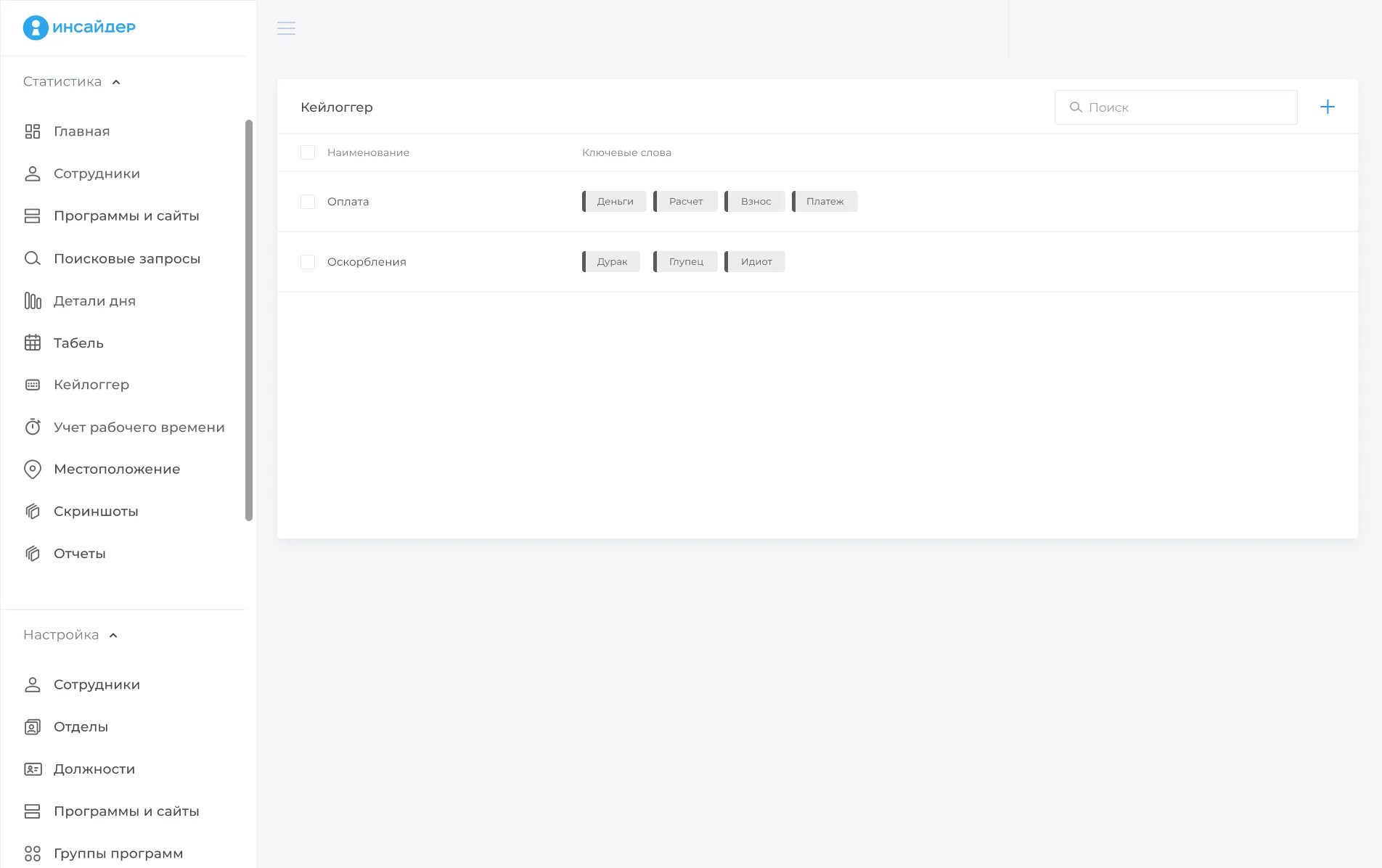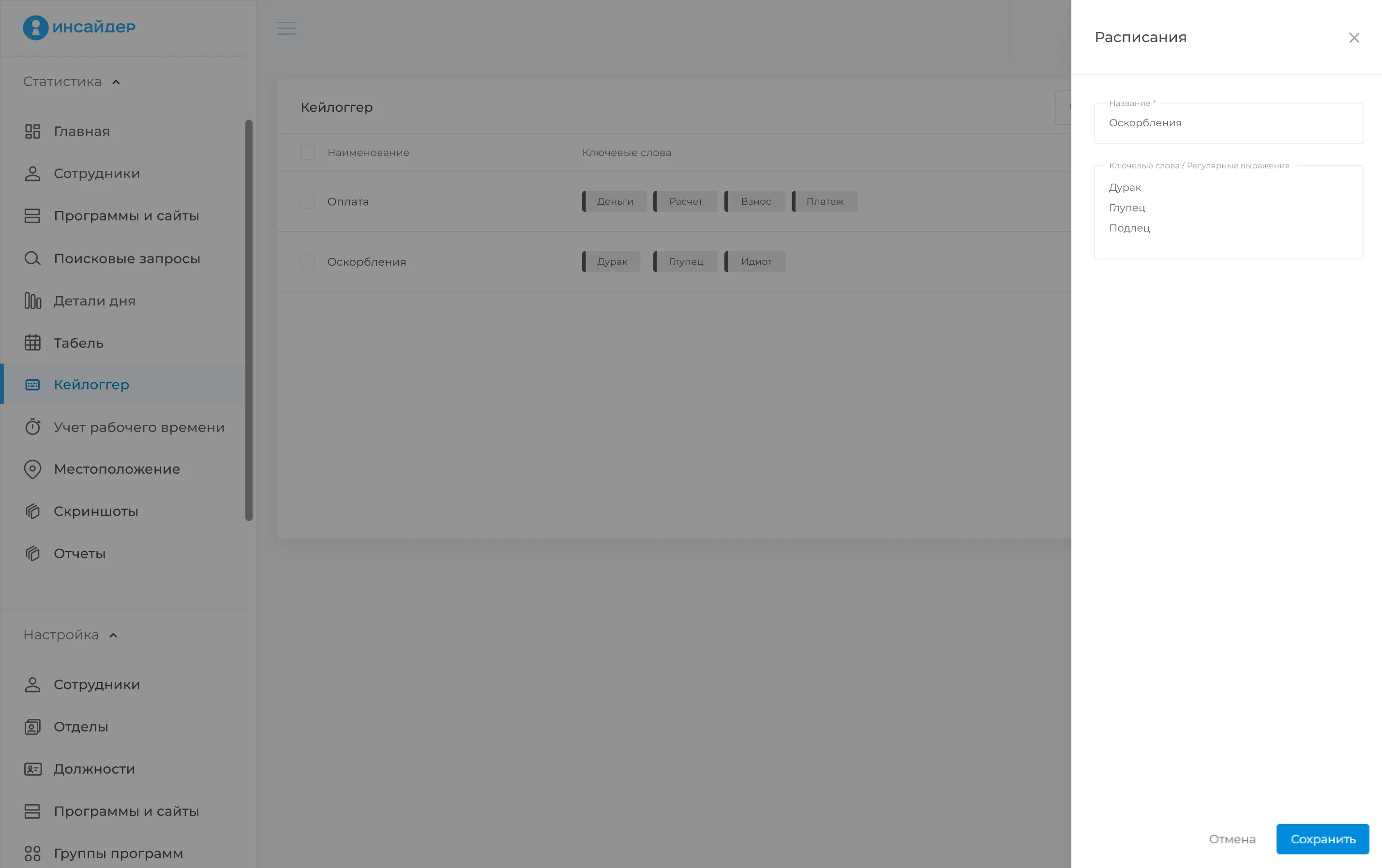 ИНСАЙДЕР позволяет классифицировать ключевые фразы по группам. То есть вы можете создать подборку слов, ввод которых будет сигнализировать о том, что сотрудник занимается личными делами, оскорбляет кого-то и совершает любое другое нарушение.