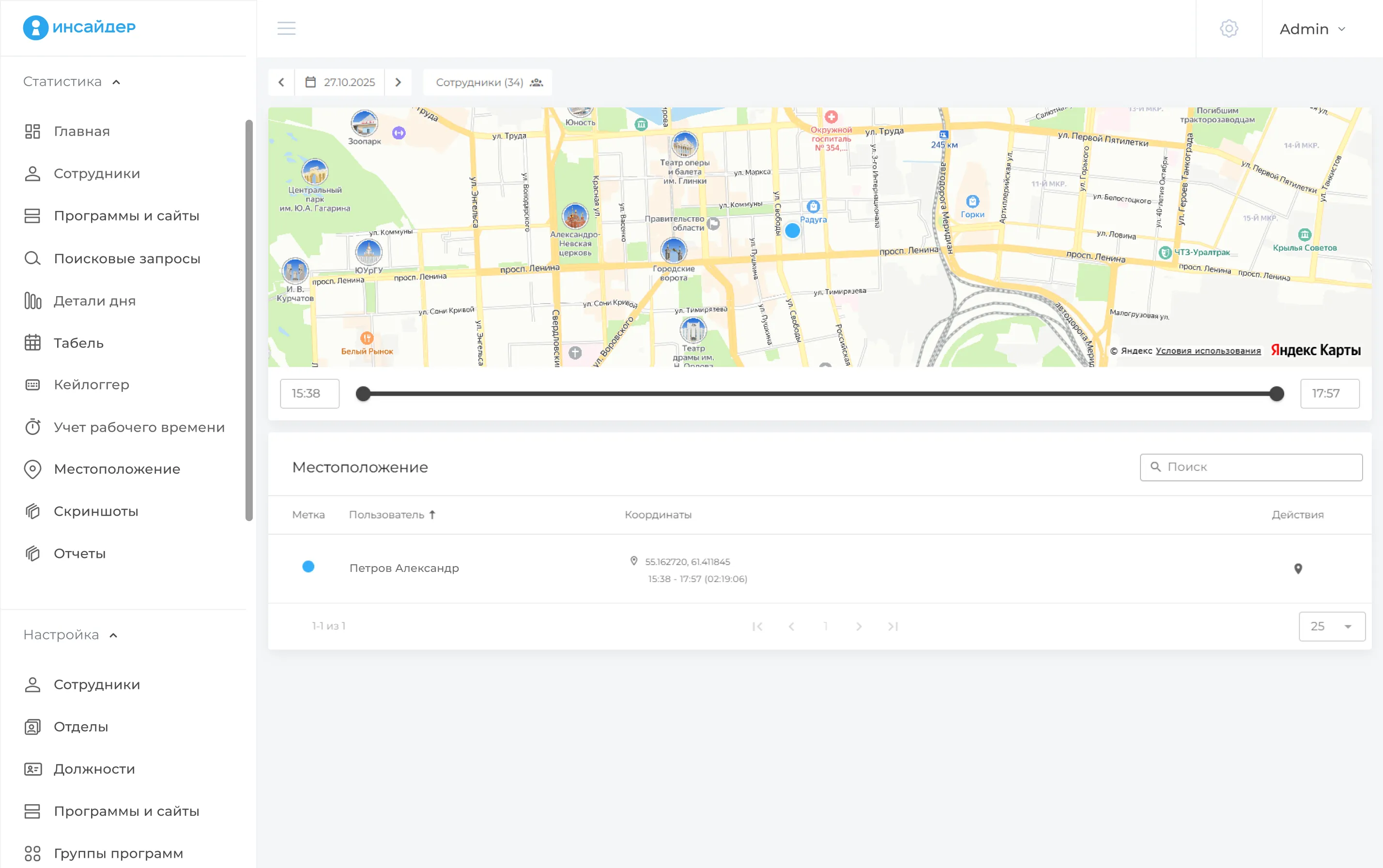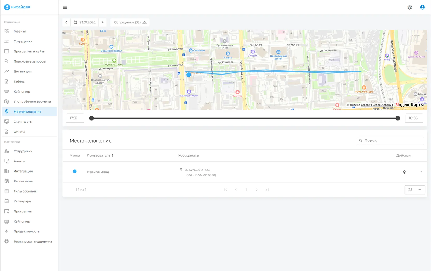 Отчет позволяет узнать, где именно находились удаленные специалисты в конкретный промежуток времени. Для удобства просмотра можно фильтровать данные по сотрудникам и дате.