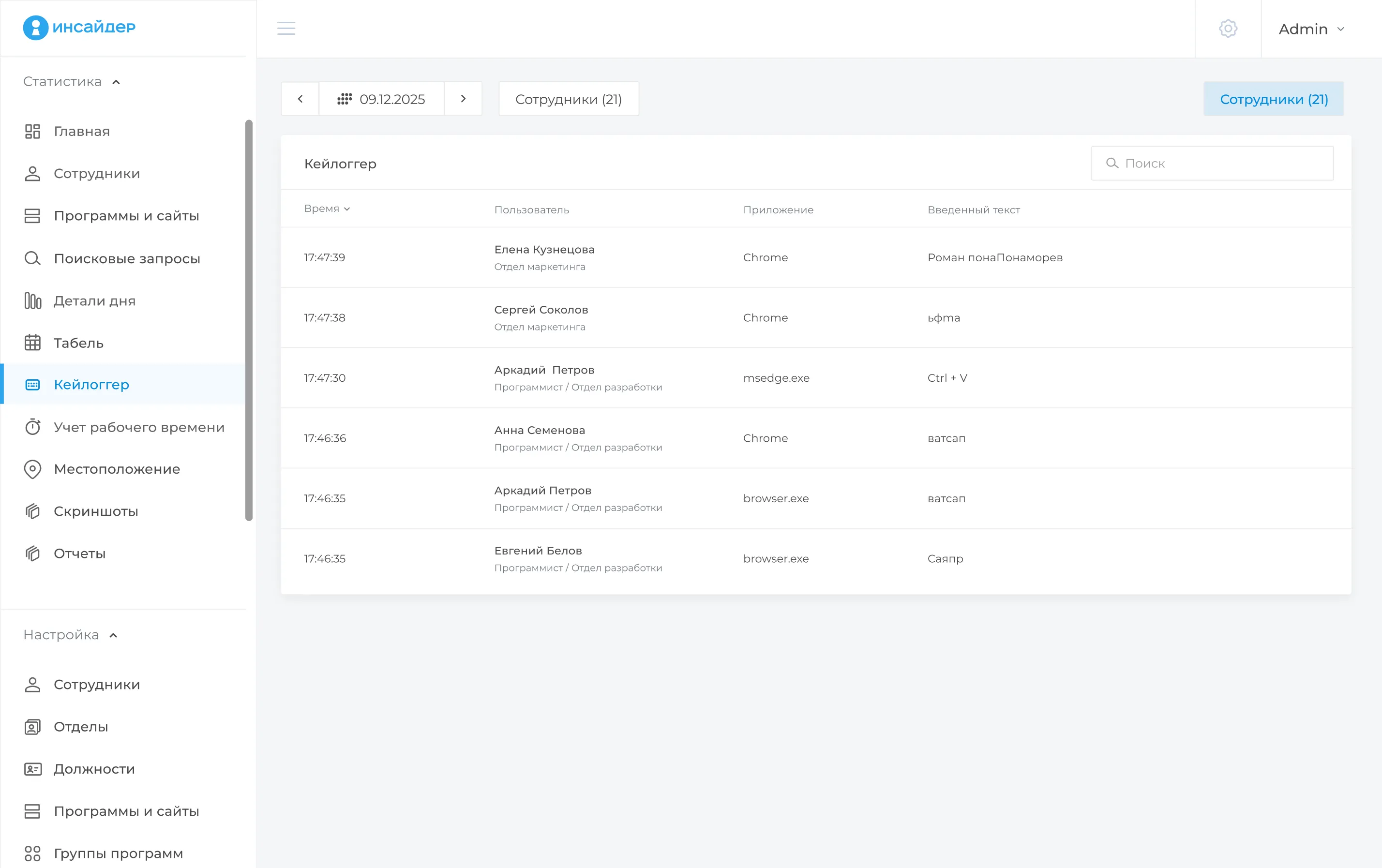 ИНСАЙДЕР собирает информацию обо всех действиях сотрудников, в том числе о запуске приложений и посещении сайтов в течение дня.