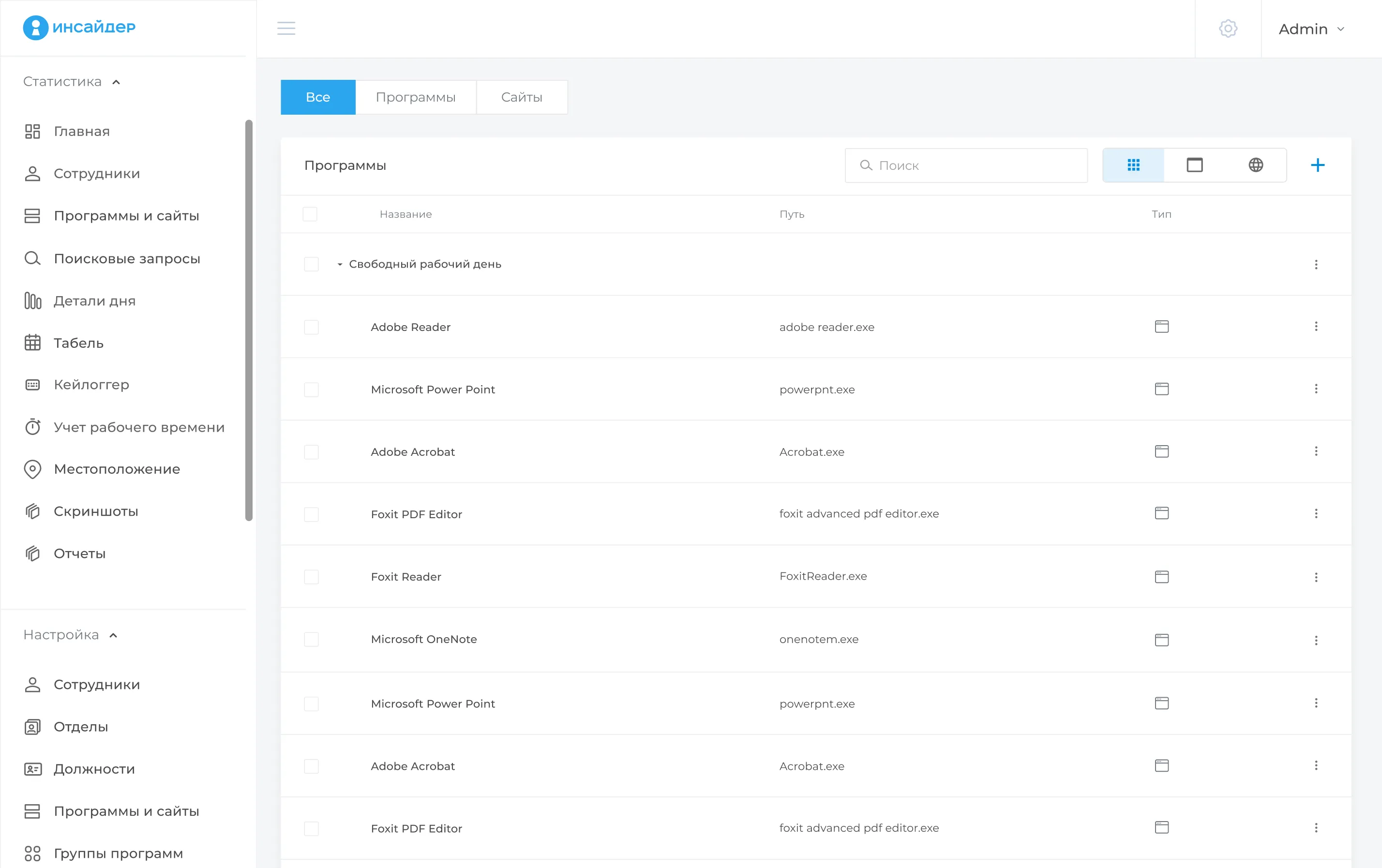 Показывает, какие программы и сайты используют подчиненные в течение дня. С помощью этого отчета руководитель сможет узнать, какие приложения чаще всего отвлекают сотрудников от выполнения задач и негативно сказываются на производительности, и настроить списки разрешенных ресурсов.