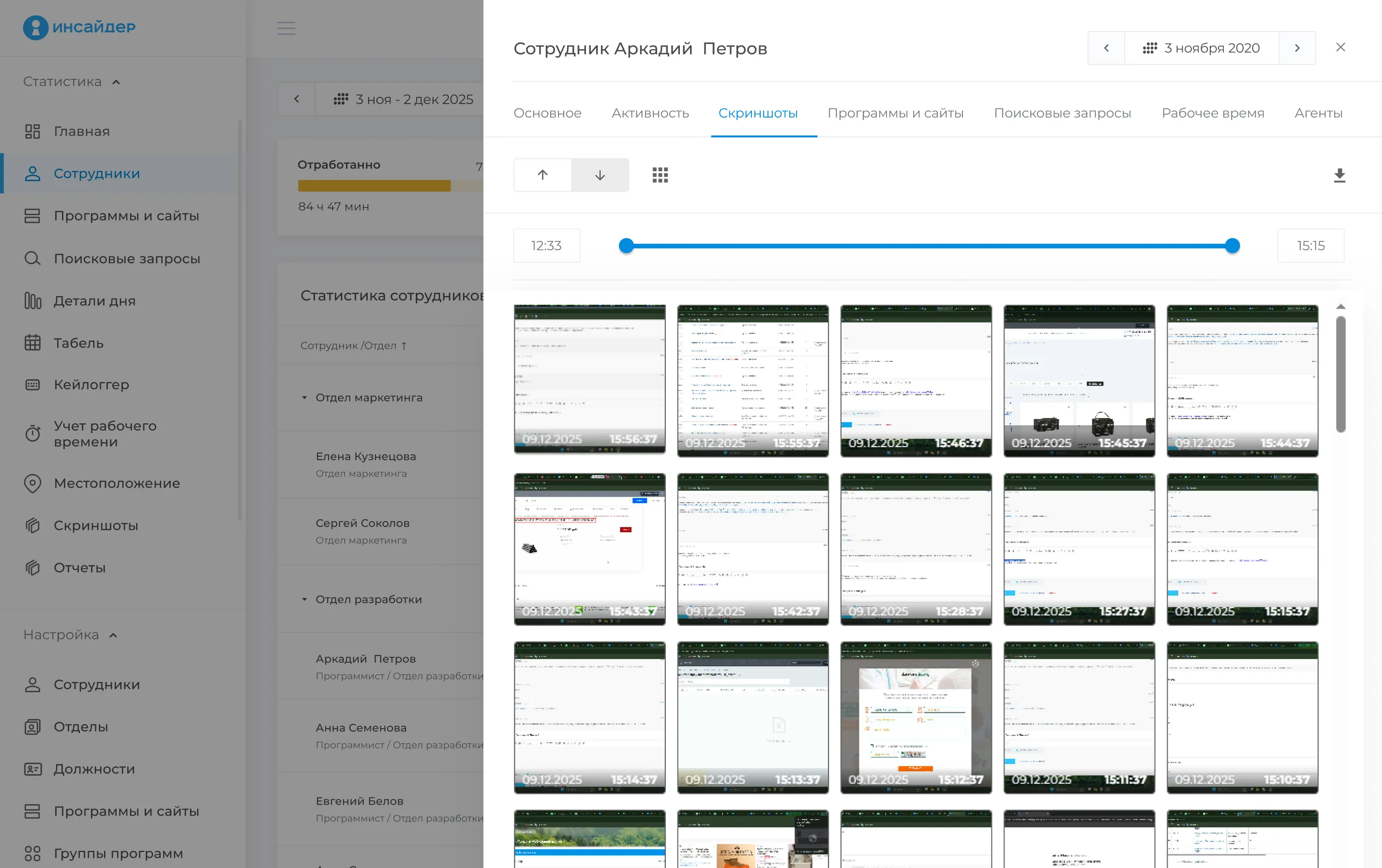 ИНСАЙДЕР автоматически делает снимки экрана при нарушении политики безопасности или в конкретные промежутки времени, и сохраняет их на сервере. При необходимости руководитель может в любой момент посмотреть скриншоты за определенный период.